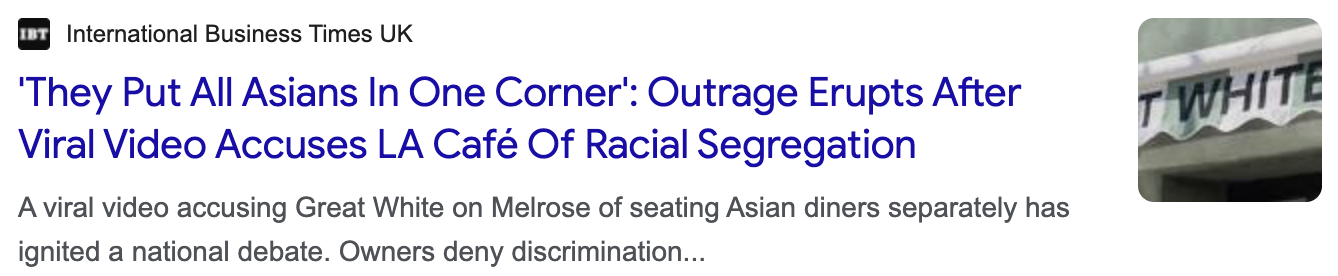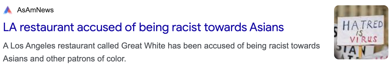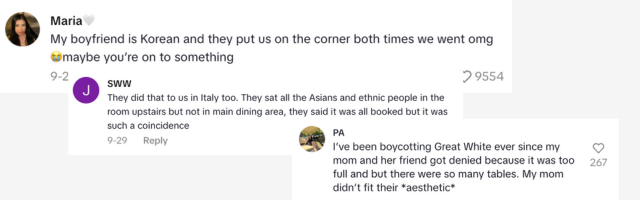 "I've been boycotting Great White ever since my mom and her friend got denied because it was too full and but there were so many tables. My mom didn't fit their *aesthetic*"