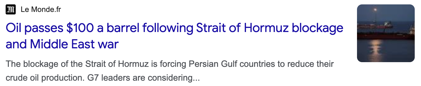 Oil passes $100 a barrel following Strait of Hormuz blockage and Middle East war